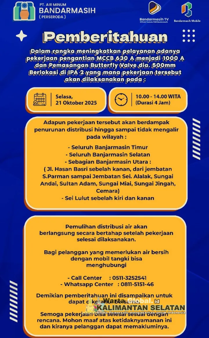 "Pendistribusian air akan mengalami penurunan tekanan hingga mati total saat pengerjaan berlangsung, dilakukan Selasa besok mulai pukul 10.00 sampai 14.00, kurang lebih selama 4 jam," jelas Murjani Humas PT Air Minum Bandarmasih.
